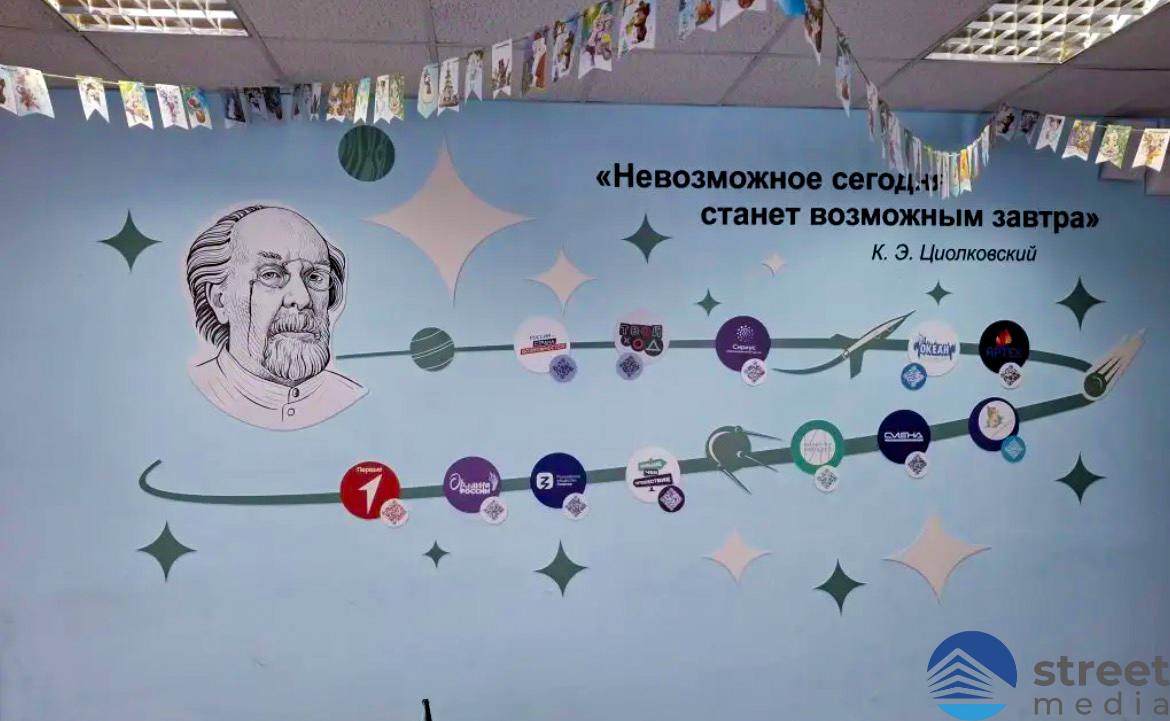 В рамках проекта были оформлены внутренние стены образовательного учреждения с использованием тематических иллюстраций. В оформлении были использованы образы, связанные с историей науки и космоса, а также визуальные элементы, направленные на формирование у школьников интереса к знаниям и творчеству.