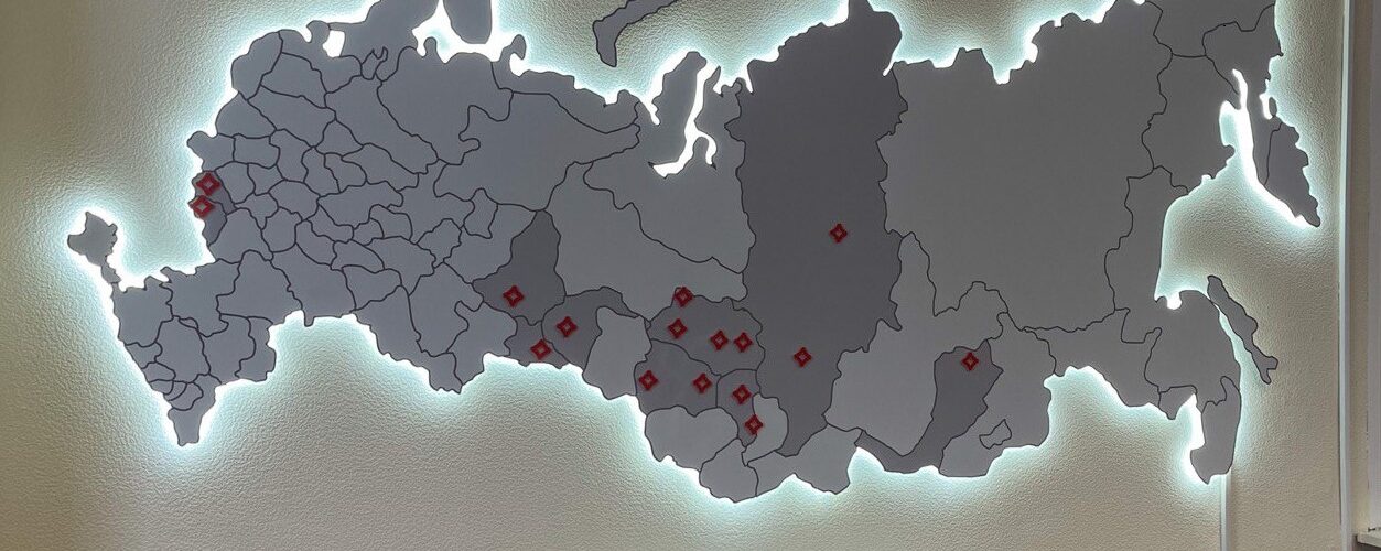 Карта представляет собой панно, на котором отображена география присутствия холдинга. Основой для изготовления послужил алюминиевый композит, обеспечивающий изделию минимальный вес, структурную жесткость и долговечность. Для визуального выделения ключевых объектов и элементов инфраструктуры были использованы элементы из оргстекла, создающие объемный эффект. Использование котражурной подсветки по периметру карты подчеркнуло границы, а также стало элементом интерьерной подсветки в вечернее время.