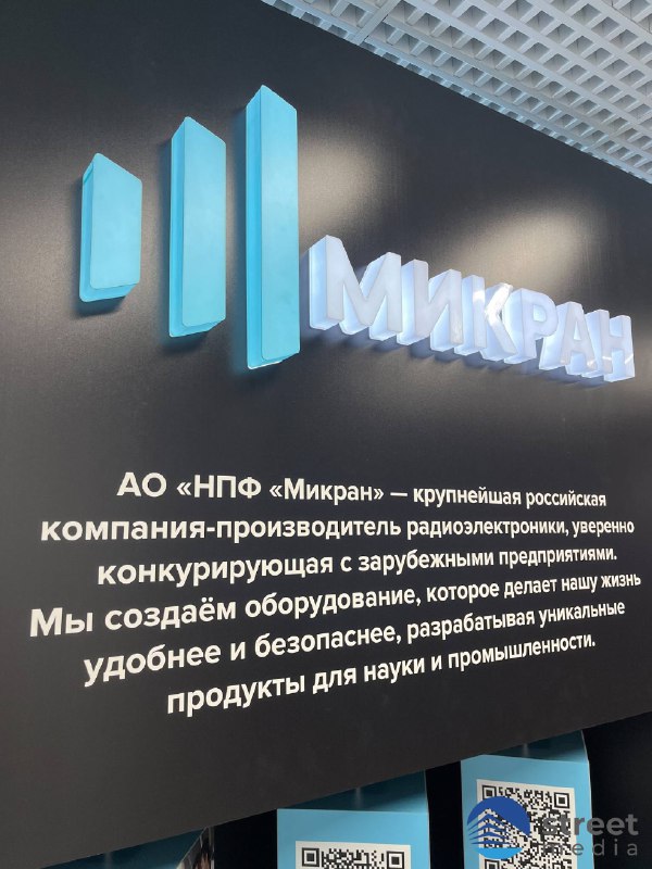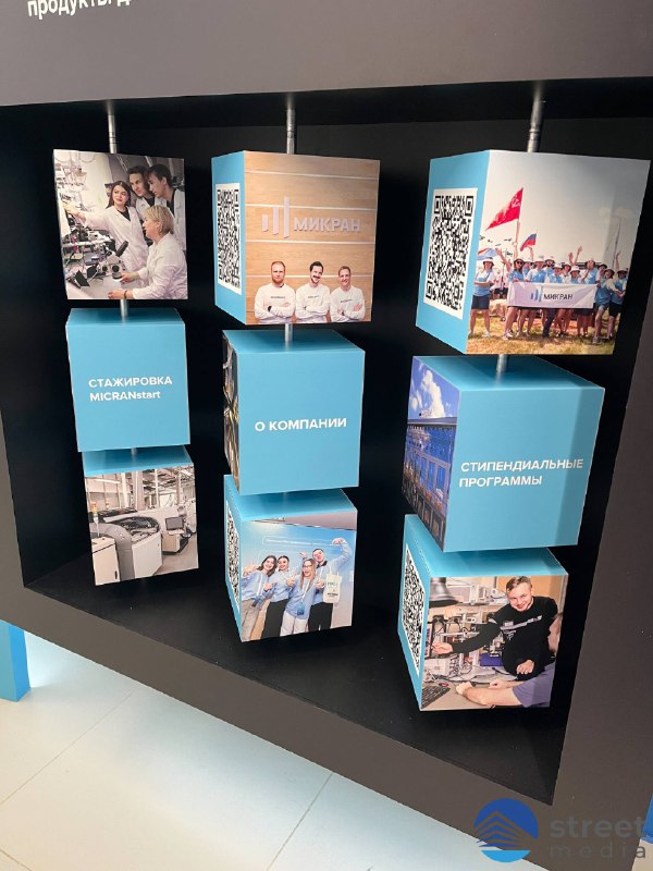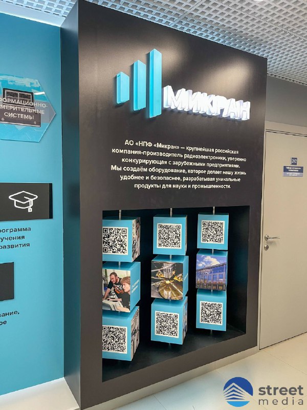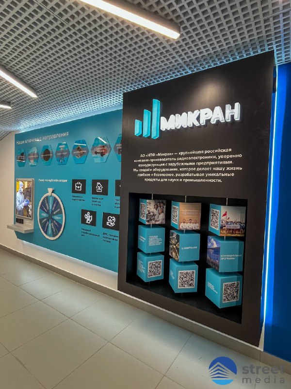 На стенде представлены ключевые направления деятельности компании «Микран», а также информационные блоки с графическими элементами и QR-кодами, позволяющими получить дополнительную информацию в цифровом формате. Объёмные кубы создают эффектную и наглядную подачу контента.